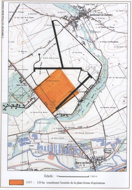Plan du terrain de Juvincourt montrant la partie d'origine de 1937 en couleur et en noir les extensions et constructions allemandes en noir débutés en 1941 par l'organisation Todt.