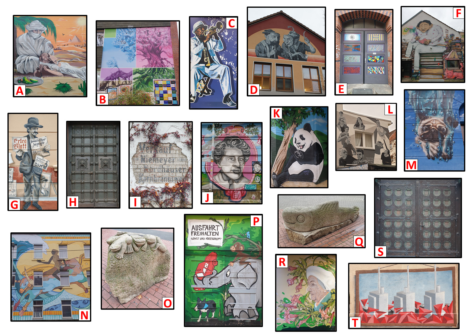 Im Folgenden müssen 20 Bilder in Linden-Nord gesucht werden, um vor Ort je eine Frage beantworten zu können. Die Übersicht (bessere Qualität) der zu suchenden Bilder findet ihr nachfolgend.