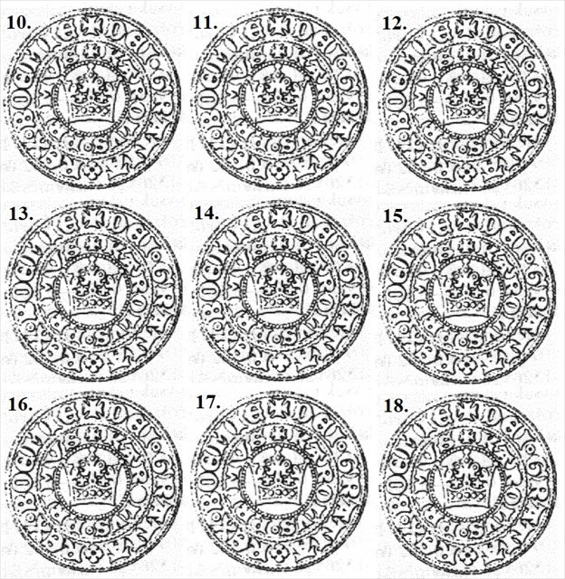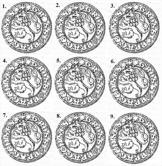 Pojďme se detailně podívat na groš, který byl v oběhu za vlády Karla IV. Je zde vždy devět variant líce nebo rubu mince. Pozor, vždy jen dva obrázky jsou ty pravé. Ostatní mají drobné změny. Seřaďme je podle číselné řady př. 1, 2, 10, 11. Vynecháme čárky a výsledný kód vložíme do ověřovače.