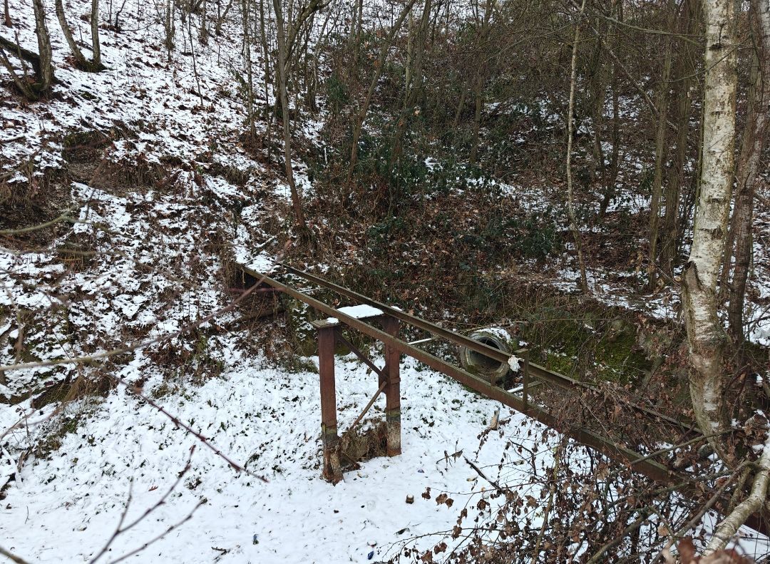 Dříve tu asi byla lávka pro jakési technické práce, ale zůstaly jen dvě traverzy. Můžete jít i z druhé strany, ale dostat se tam nebude lehké.