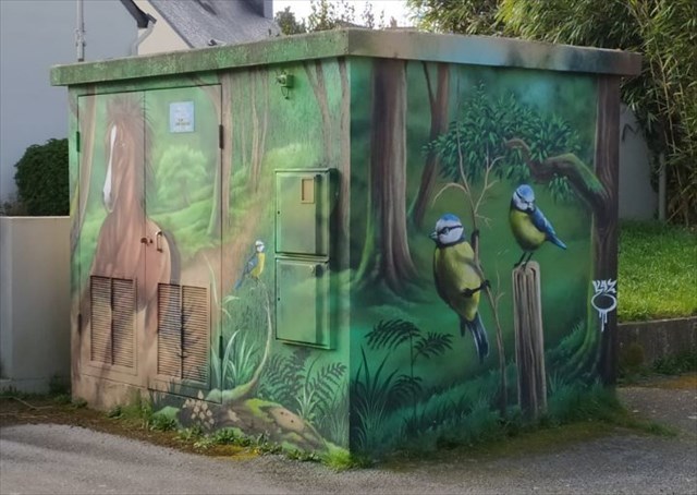 C’est au début de la rue qui a été dénommée en sa mémoire que se trouve un transformateur. Situé sur la gauche d’une aire de stationnement, il était bien terne avant que Kaz ne lui donne des couleurs. C’est désormais un décor de sous-bois qui égaye ce lieu. Dans cet univers de verdure, le graffeur a représenté 3 mésanges bleues et un cheval qui galope sur le chemin. Il doit sa présence à la demande faite pars deux jeunes personnes.