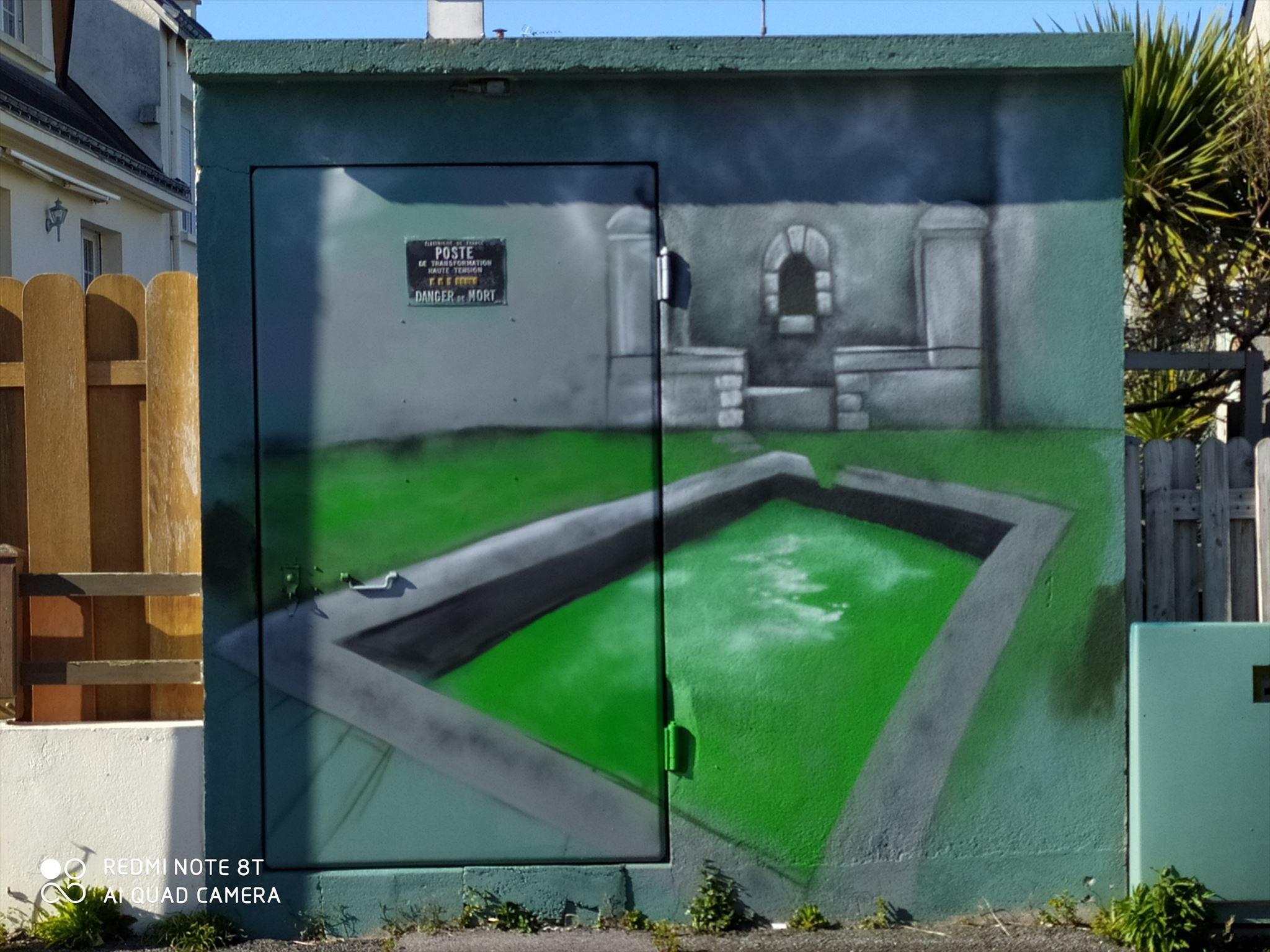 Le transformateur qui a troqué sa triste livrée gris béton contre l’habit vert des académiciens est à proximité de l’angle des rues professeur Lote et Léo Lagrange. Cette fresque, non signée et non datée, évoque un lieu très proche. La fontaine et lavoir de Saint Eloi. Vous pourrez les découvrir ; pour ceux que ne le connaisse pas, en allant chercher le dispositif final de cette cache.