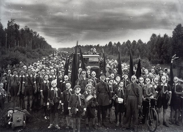 Open air sborové provedení Cimrmanovy opery Fan Thomas v r. 1914 na turné opery Garnier ve Verdunu (někteří vědci se podle masek a nápisů Anticorona na podrážkách bot zcela mylně domnívají, že fotografie pochází až z let 2020 - 2021)