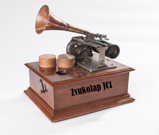 Dochovaný exemplář Mistrova přístroje Zvukolap JC1; na fotografii jsou vidět 2 hliněné válečky nachystané na nahrávání