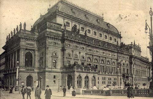 Budova Národního divadla před příchodem Cimrmana (Cimrman zachycen vlevo při vstupu do budovy) … a vpravo poté, co v divadle udělal pořádek a nastaly viditelně velké změny