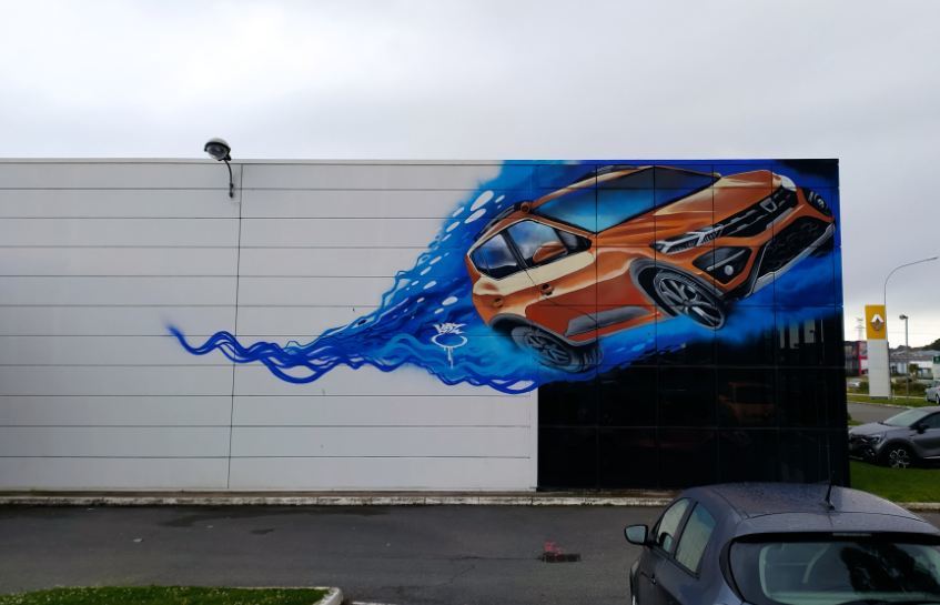 Kaz ne se contente pas de représenter des animaux, réels ou imaginaires, dans des cadres champêtres ou apocalyptiques. Il a également une passion pour tout ce qui est mécanique. C’est ainsi que sur la façade Nord de la concession Bodemer, il a graffé l’un des derniers modèles de la marque Dacia, la Sandero Stepway. Le véhicule, de couleur orange, semble glisser sur une flaque bleue.