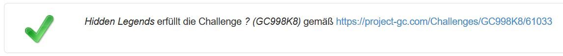 Es geht also nicht, eine Write Note vom vor Ort Fund in ein Foundlog an diesem Datum umzuändern. Der Onlinefoundlog hat vom Datum her nach oder an dem Datum des Logs vor Ort und nach oder an dem Datum der Erfüllung der Challenge zu liegen. Dies liegt auch darin begründet, daß ich als Owner (s.o.) die Erfüllung der Challenge auch selbst auf Project-GC überprüfen können soll und müßte. Als Finder muß ich das im Log nämlich eigentlich nicht, es wäre aber nett, wenn ihr dies trotzdem tut. Sowie auch einen Screenshot vom Checker hochladet, da die Challenge vielleicht wieder als nicht erfüllt angezeigt wird.