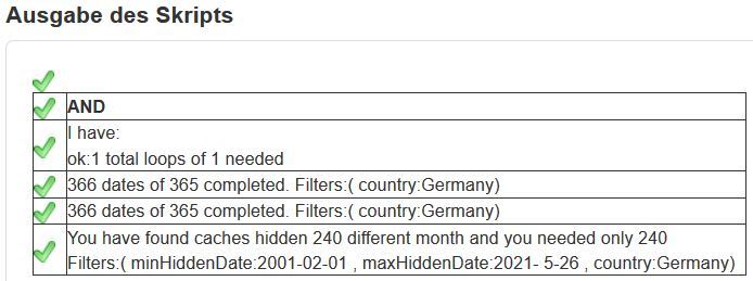 Die Zahlen der Anzahl in Klammern (366) beziehen sich auf die neue Regelung für Challenges, daß der 29.2. kein Bestandteil der Challenge sein darf. Ihr seid aber gerne eingeladen, diesen Teil auch zu erfüllen. Bei der deutschen Jasmer-Matrix könnt ihr natürlich auch für alle Monate seit Februar 2001 einen Cache finden (noch geht das ja), wenn ihr wollt. Um aber dem 20-jährigen Jubiläum Rechnung zu tragen, sowie der Tatsache, daß es nicht mehr zu jedem Monat endlos viele findbare Caches gibt, müsst ihr nicht für alle Monate einen finden. Stand Heute müsst ihr 240 von 244 Möglichen finden. So bleibt die Challenge auch für immer erfüllt, wenn ihr sie einmal erfüllt habt.