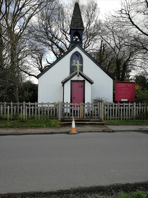 The church was built as a temporary structure on land given to the people of West End village by Queen Victoria, from the royal estate of Claremont. The idea was for the servants of the house and the farm labourers there to have easier access to a place of worship ("The Parish of Esher"). Not as elaborate as the well-known Deepcut Garrison "Tin Church," also in Surrey, St George's is nevertheless an essential part of this perfect village scene, facing the green with its cricket pitch and pond. Such churches were easily assembled, and could be sent to small villages at home or outposts of empire. They do tend to heat up in summer and stay cold in winter, and the rain makes a noise on their roofs, but they have proved remarkably sturdy. As one commentator writes, "Tin Tabernacles are an important if brief and overlooked episode in the history of church architecture," and have a claim to "be recognised as listed buildings, particularly as examples of prefabrication" (Dopson 204-05).