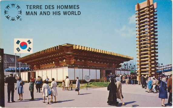 Entièrement construit de bois, le pavillon de la République de Corée résume une civilisation de 20 siècles, les réalisations étonnantes du temps présent et les aspirations d'un peuple dont l'esprit est constamment tendu vers l'avenir. À l'entrée du pavillon, une tour élégante se dresse harmonieusement dans l'atmosphère orientale se dégageant de l'ensemble. On y développe un thème poétique "Les Mains" dont l'homme se sert pour créer, se nourrir, découvrir l'univers.