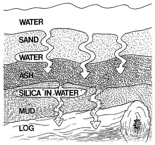 Petrified wood is a fossil that is a complete transition to stone, and is a replicate of the original tree/plant. The tree is buried by sediment preventing it from decaying due to the absence of oxygen and organisms. Mineral laden water flowing through the sediment deposits minerals in the plant's cells, replacing organic material with inorganic material.