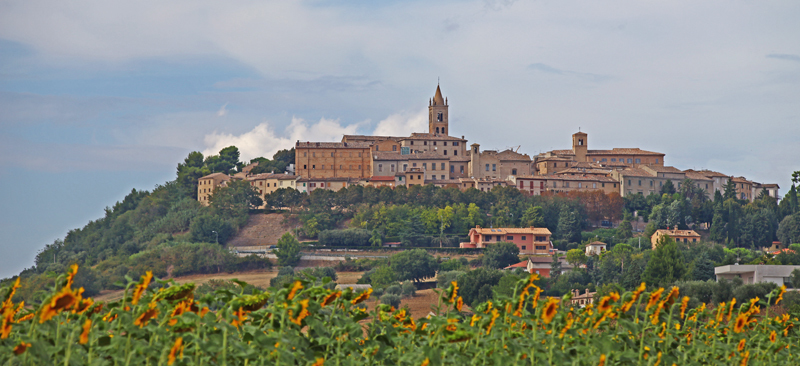 Da lontano, il borgo di Montecassiano appare quasi mistico sul colle sul quale si adagia. Sarà per le tante confraternite che nei secoli passati hanno conservato e restaurato chiese e opere d’arte, e che ancora oggi accompagnano le processioni con i loro camici colorati, gli stendardi e i crocefissi cesellati gelosamente custoditi nella seicentesca chiesa di San Giacomo, oggi museo delle Confraternite.