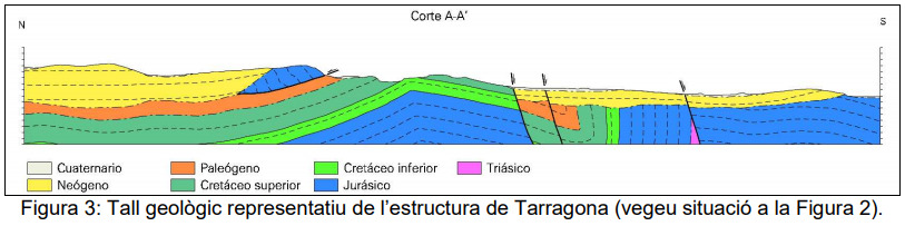 Des d’un punt de vista estructural, els dipòsits mesozoics i paleògens a l’àmbit de Tarragona estan afectats per un sistema de plecs de direcció NE-SW vergents cap al NW. Des d’aquest punt cap a mar, l’estructura alpina ve governada per un sinclinal tancat amb el flanc SE invertit.