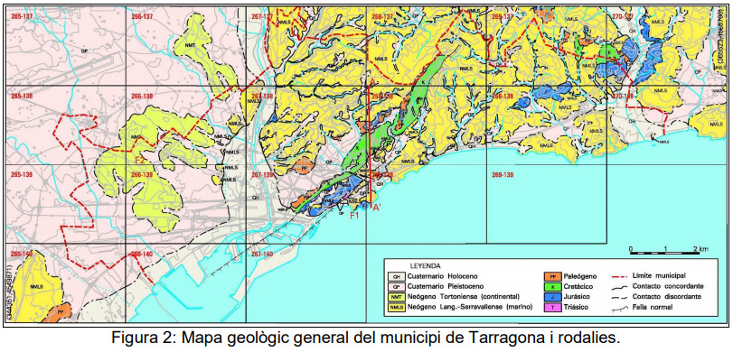 A grans trets, en l’àmbit del municipi de Tarragona, els materials prequaternaris aflorants es poden dividir en dos grans grups: els dipòsits mesozoics i paleògens afectats pel plegament Alpí i, els dipòsits miocens associats a l’etapa distensiva neògena i al rebliment de la fossa del Camp.
