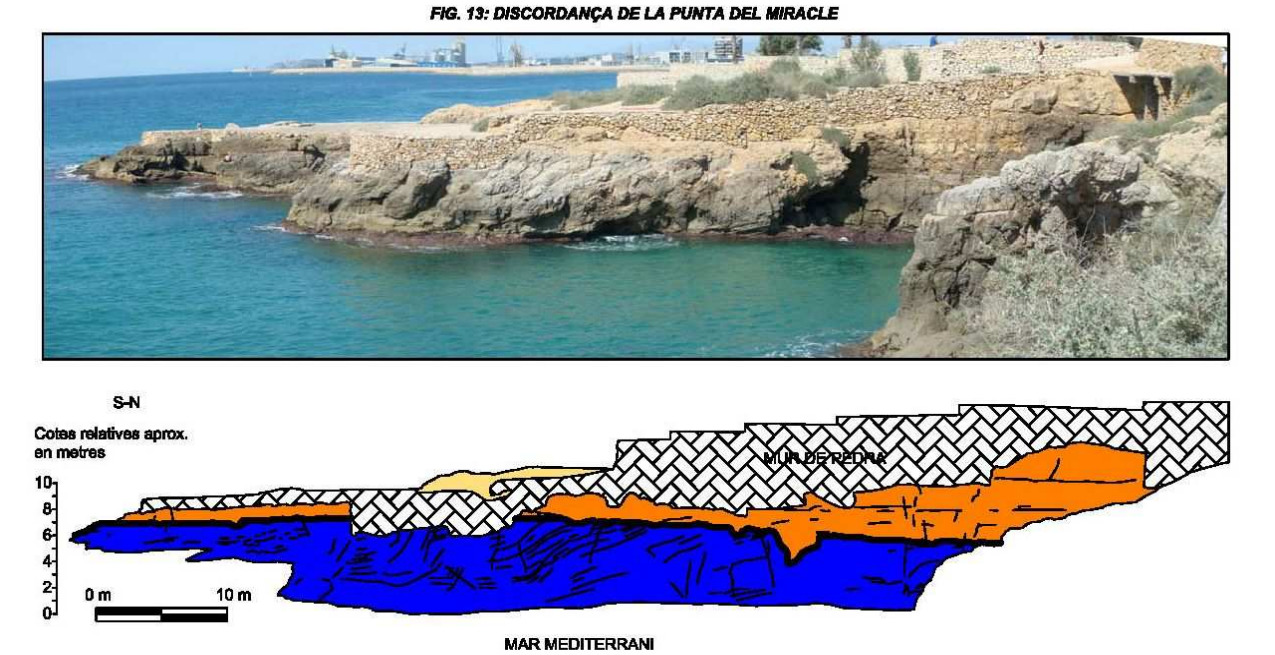 A la part marcada en ocre veiem les calcarenites bioclàstiques ocres molt fragmentades (del Miocè), en conjunt el Miocè representa una seqüència granodecreixent.