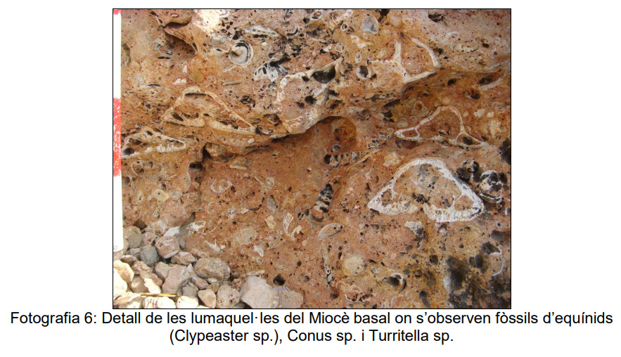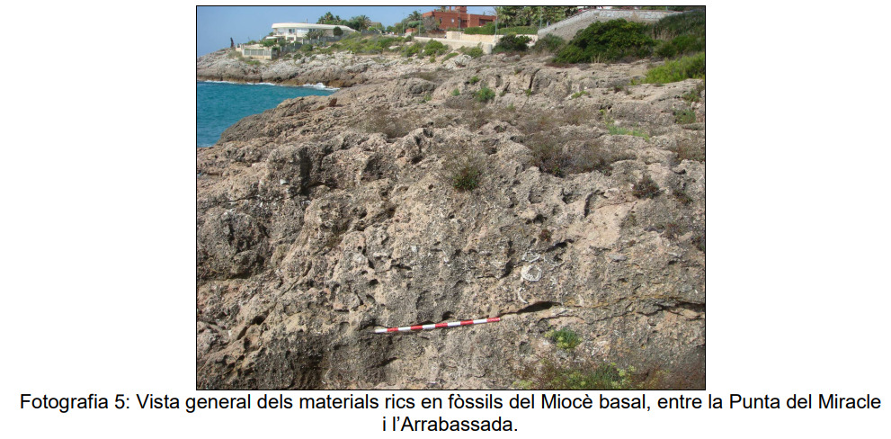 En aquesta parada observem la base del Miocè, la qual es caracteritza per ser molt rica en fòssils, motlles i restes originals. Podem veure restes de bivalves (ostrèids, pectínids), gasteròpodes (Conus sp., Turritella sp.), equínids (Clypeaster sp., Scutella sp.), algues rodofícies, restes d’ossos de mamífers i abundants signes de bioerosió.