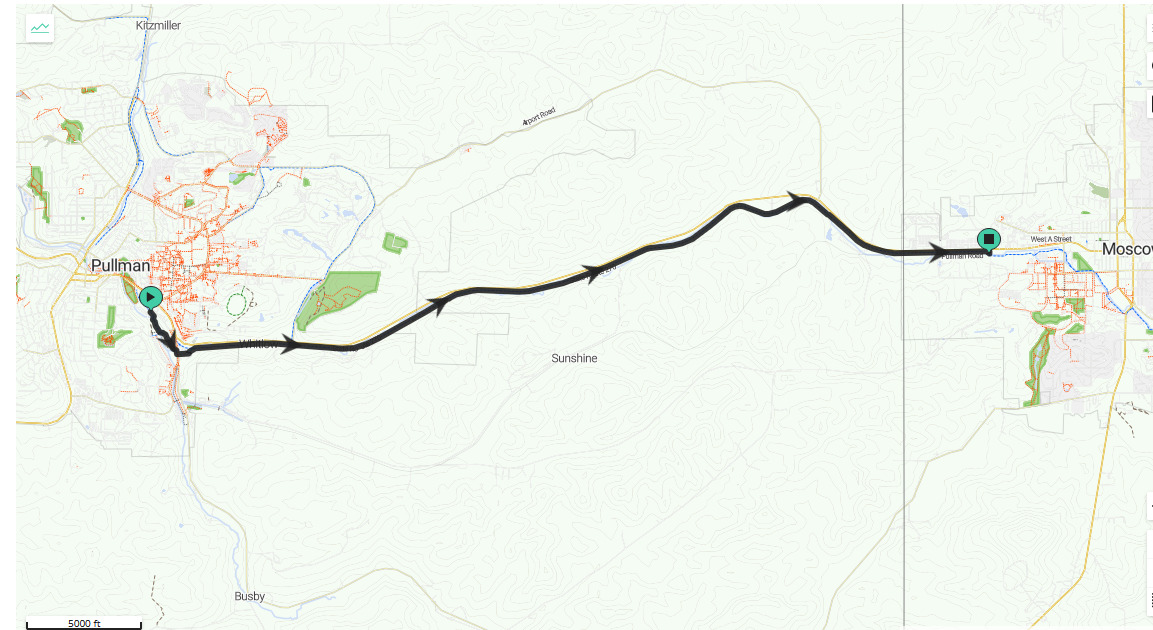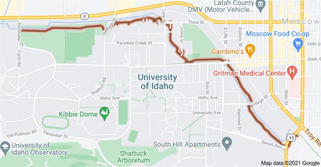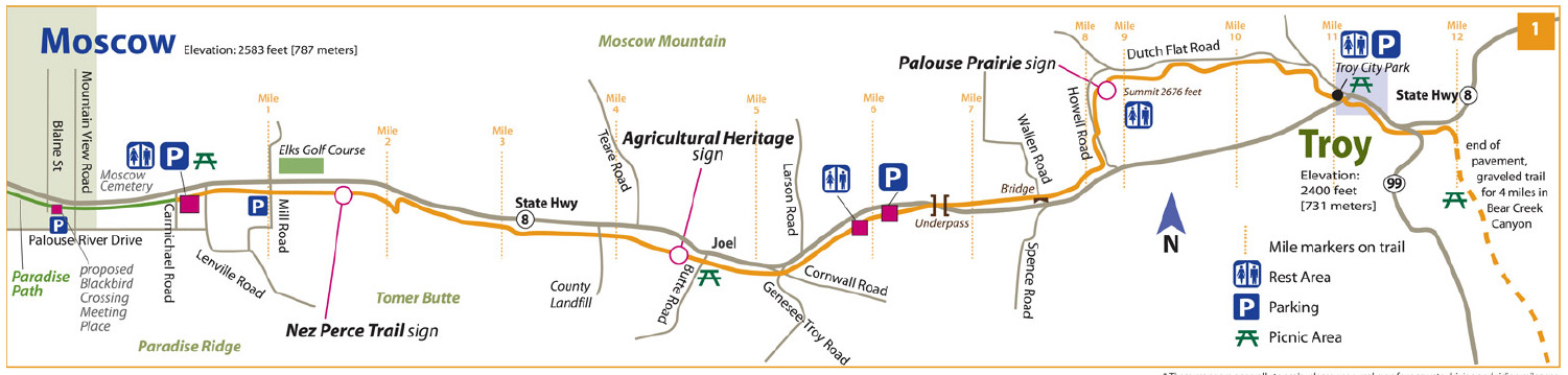 NOTE: In Moscow, park in the Palouse Mall parking lot. Cross back over SR 8 to get to the trailhead. All property to the south of SR 8 is part of the University of Idaho and not available for public parking. Be careful of traffic when crossing the highway, and also beware of cars crossing the trail at road crossings along all the trails.