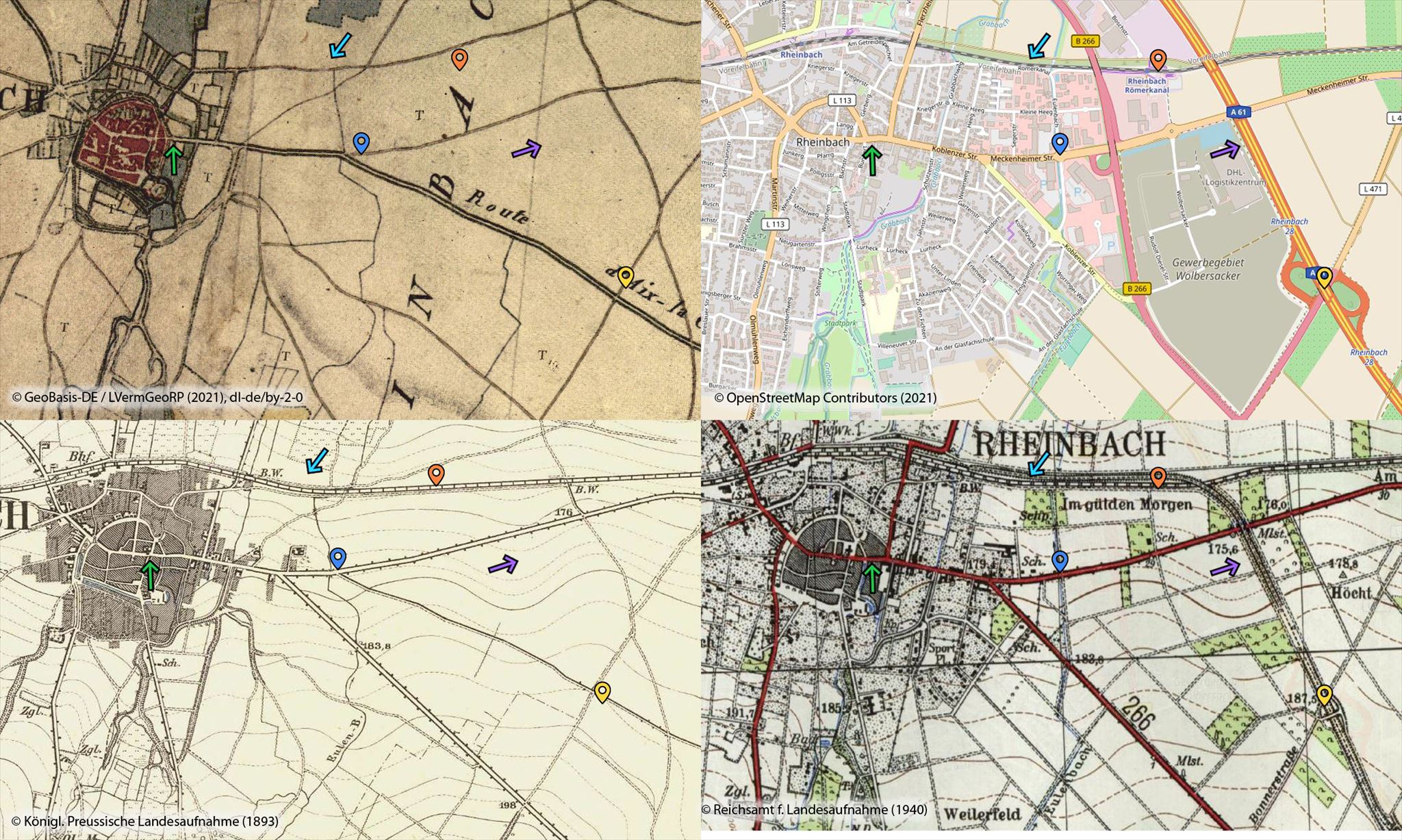 Apropos A61: Auch sie hat eine bewegte Geschichte. Wenn wir uns die älteren Karten von 1808 und 1893 ansehen, existierte damals noch keine ähnliche Struktur. Auf der preußischen Karte ist nur die Bahnverbindung Rheinbach-Meckenheim verzeichnet. Interessant ist dann die Karte von 1940, dort ist einerseits die Flurbereinigung sichtbar (parzellierte Felder, die alten Wege sind größtenteils verschwunden) und andererseits ist der Bahndamm der Unvollendeten (lila Pfeil) sichtbar. Jene Bahnstrecke, die das Ahrtal mit Liblar verbinden sollte (und später Saarland und Ruhrgebiet), aber im Ersten Weltkrieg nicht weitergebaut wurde. Auf der 1940er Karte ist der Bahndamm mit "Radfernweg" notiert, es war also schon damals eine Fernstraße. Heute verläuft auf dem alten Bahndamm zwischen Rheinbach und Ringen die Autobahn.