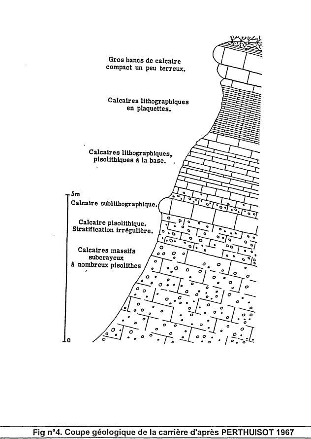 Au-dessus de ces derniers niveaux se trouvent des calcaires plus fins lithographiques à subtilographiques plus finement lités pouvant même posséder une structure de calcaire en plaquettes. Ces formations plus dures, altérées et fragmentées par le gel sont bien visibles en partie haute du front de taille. La stratification, peu présente, est penchée de quelques degrés vers l'Est.
