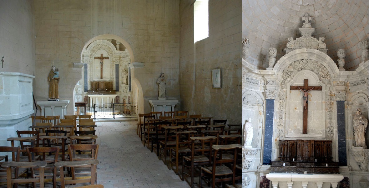 L’église d’Artannes, classée Monument Historique, placée sur une éminence proche du Thouet est, comme beaucoup d’autres églises du Saumurois, dédiée à Saint-Pierre. C’est un petit édifice, en grande partie du XIIème siècle, dont l’étroite nef nue et vide est couverte en bois, se resserre à l’entre du chœur sous un arc plein cintre port par deux gros piliers carrés où s’appuient les autels, à droite de St JOSEPH et à gauche de la VIERGE.