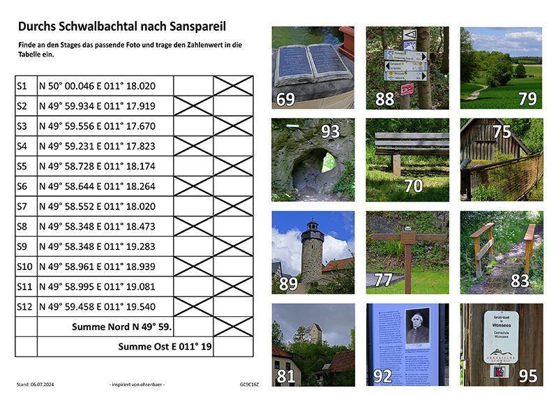 Am idyllischen Schwalmbach entlang, führt der Talwanderweg ohne große Höhenunterschiede nach Wonsees. Durch die leider recht verwachsenen Wacholderhänge geht es dann nach Sanspareil. Die Wanderung führt bewusst nicht durch den Felsengarten, diesen kann man nach Lust und Laune aber problemlos integrieren und die dortigen Caches besuchen. Ohne Felsengarten verkürzt sich die Tour um ca. 2km und 1h, sehenswert ist die Anlage aber allemal, AdventureLab mit Bonus ergeben einen schönen Rundgang.