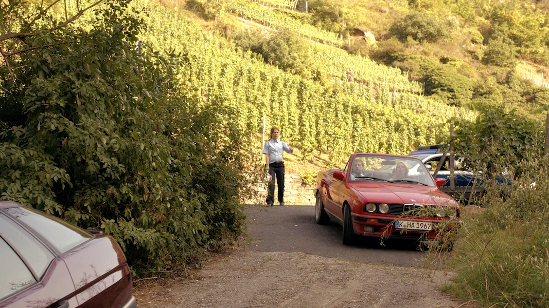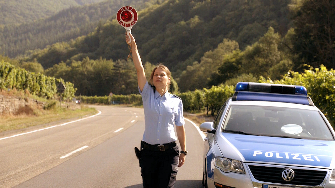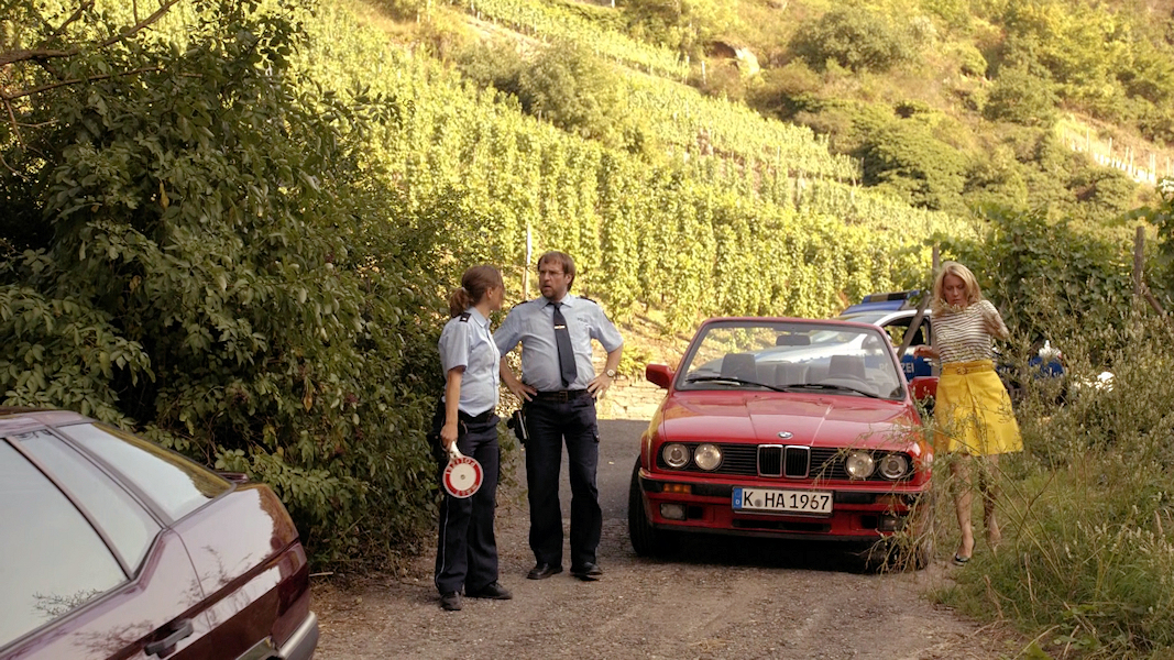 Szene: Sophie Haas und Dietmar Schäffer fahren mit dem Cabrio zum Tatort; Bärbel Schmied ist mit Dienstwagen und Winkerkelle bereits vor Ort.