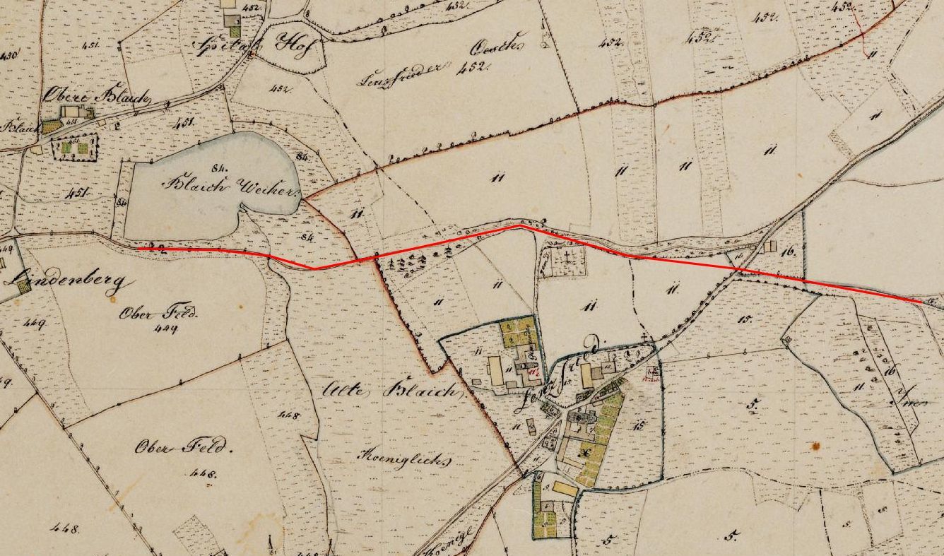 Von Cambodunum (Lindenberg) in Richtung Osten südlich am ehemaligen Blaichweiher vorbei den heutigen Gerhardingerweg hinauf.