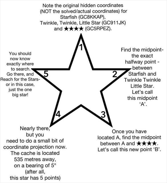 One trend I noticed is that there are a number of star-themed caches in a fairly local area, almost entirely by different owners and independent of each other (Starfish (GC8KKAP), Twinkle, Twinkle, Little Star (GC911JK), ★★★★ (GC5RPEZ) and the ‘Stardust’ trail (GC98G3D is #1; directly north of this cache’s coordinates.)