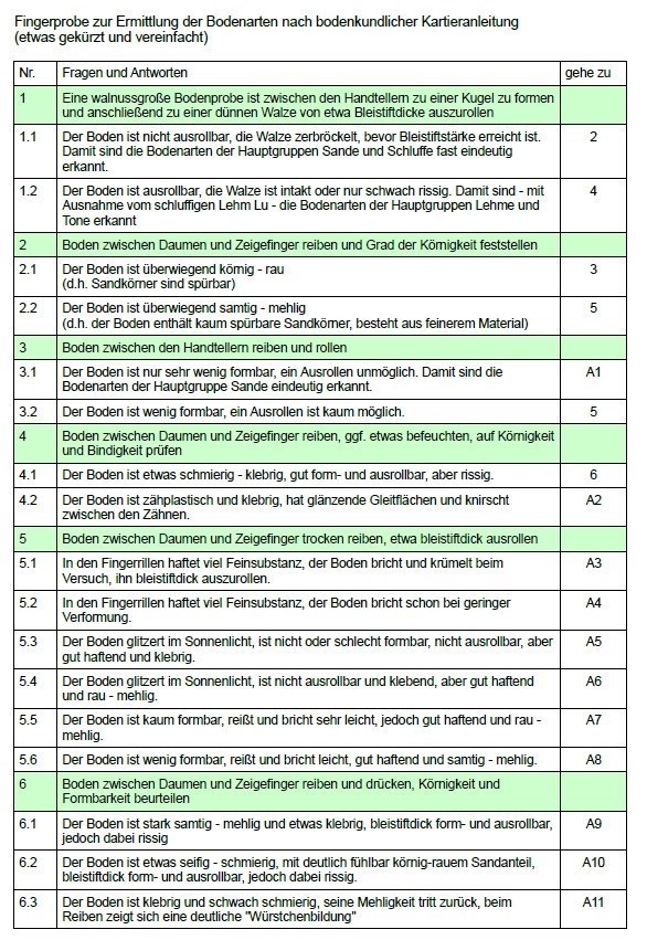 2. Führt die im Listing beschriebene Fingerprobe anhand der beiden Tabellen durch. Zu welchem Ergebnis (A1 bis A11) kommt ihr, also um welche Bodenart handelt es sich genau? Handelt es sich eher um fetten oder mageren Lehm? Gebt bitte dazu den Wegpunkt an, an welchem ihr die Probe durchgeführt habt.