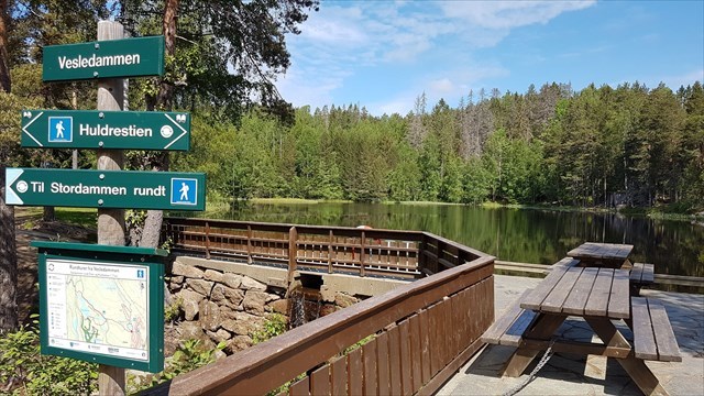 Rundturen starter ved Vesledammens demning langs østre bredde. Stien er en temasti, med blåmerking og huldreøyne. Etter Vesledammen, står det skiltet til Huldras hest, hvor du kan ta deg en ridetur, og lese eventyret om hvordan Huldreåsen kan ha fått sitt navn.