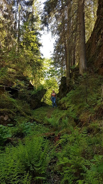 GPS forhold er nokså dårlig i juvet men dammen er god synlig. Cachen er en PET som henger i en død? gran midt på stien, i bunnen av juvet. God tur :)