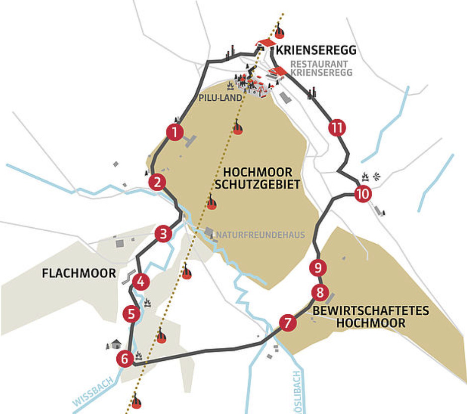 Erlebe die Welt der Moore, Moose, Bäche und Wiesen. Auf dem Rundweg erfährst Du allerlei wissenswertes zur Geschichte, Flora und Fauna rund um den Pilatus. Geniesse das geschützte Hochmoor mit allen Sinnen. Selbst mit Füssen kannst Du einiges entdecken auf dem Barfusspfad.