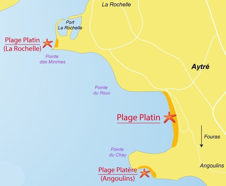 Plage de sable au sud de La Rochelle Au Sud de La Rochelle, sur la commune d'Aytré, la plage du Platin est une grande plage de sable de 1,7 km bordée de petites dunes. Elle s'étend jusqu'à la commune d'Angoulins, entre les Pointes du Roux et celle du Chay. Cette situation préservée dans l'anse de Godechaud en fait une des plages où l'eau serait la plus chaude pour la baignade. Vous pouvez aussi profiter de la balade le long du littoral, ponctuée de carrelets de pêche. A marée basse les chars à voile profitent du retrait de la mer (hors saison). Cette plage est prisée des amateurs de kite-surf (attention toutefois aux parc à huîtres au large).