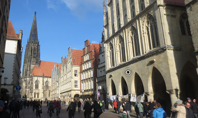 Sie fährt fort: „Ich habe Ihnen ein paar Beweise mitgebracht. Schauen Sie. Zum Beispiel dieses Bild unseres schönen alten Rathauses. Sie können eindeutig erkennen, dass dort am Prinzipalmarkt bereits das Zeichen des Kreises über dem Eingang zu sehen ist!
