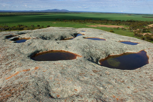 A panhole is a shallow depression or basin eroded into flat or gently sloping cohesive rock. Confusingly, some authors refer to panholes also as potholes, which is a term typically used for similarly shaped riverine landforms. Similar terms for this feature are gnamma (Australia), opferkessel (German, roughly “sacrificial basin”), armchair hollows, weathering pans (or pits) and solution pans (or pits). Other German names include kamenitza and kamenica. In Portuguese and Galician are called pias. In Namaqualand, such rock pools in granite, gnammas, are called !gau.