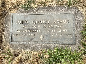 Reference Point G (Bonus): John Quincy Adams. Hillsboro Pioneer Cemetery contains many graves of soldiers who fought for the Union during the Civil War. Graves for Confederate veterans are rare. One such grave is that of John Quincy Adams (not the one of presidential fame). At the start of the Civil War he traveled back to Missouri to enlist, and served in the same regiment as Francis A. Bailey (Wpt B).