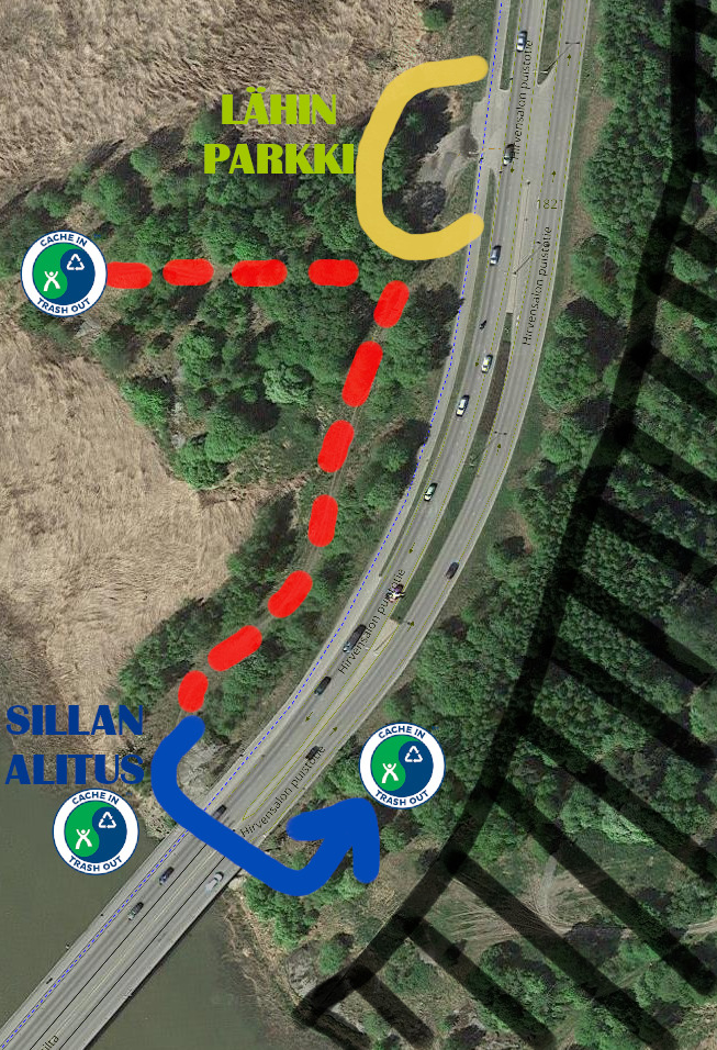 Tielle ei pidä missään nimessä mennä! Kulku tien toiselle puolelle tapahtuu Hirvensalon sillan alta. Alueen rajana idän suunnassa on Vähä-Heikkilän varuskunnan aita, sitä ei pidä ylittää. Kätköllä käyneet tietävät, että reitti on haastava, ja jalkineet kannattaa valita sen mukaan. Mutta rannoillakin riittää poimittavaa joten kyllä helpompiterrainisiakin kohteita löytyy alueelta!