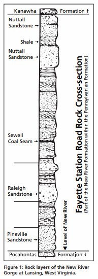 This spot offers good views of the New River, where we can observe several geologic process taking place. The rocks in this part of the gorge are mostly shale and sandstone (with some layers of coal as well). Siltstone and sandstone are both sedimentary rocks. Siltstone is mostly composed of silt and has a gray/red/brown color. Sandstone is composed of sand particles and can also be found in variety of colors including tan, brown, yellow, red, gray and white. Sandstone layers are highly resistant to weathering and erosion because of it has a high quartz content. Here we can view two important geologic processes taking place. Weathering causes the rocks to break down. Then erosion transports the sediments away from where they originated. There are two two types of weathering processes, physical or chemical. Physical weathering breaks rocks apart without changing their chemical composition. For example fast moving water can cause rocks to collide with each other, breaking off small pieces. Another example is frost action. When water freezes it expands. When a small amount of water gets into cracks within the rock and then freezes, it gradually keeps expanding the crack within the rock wider and wider until it breaks off. Lastly there are plant roots. When plants grow in cracks within rocks, their roots can cause the crack to become larger and eventually break apart the rock. Chemical weathering in contrast breaks apart the rock by chemical reaction. Examples include oxidation, hydrolysis, or carbonation. Oxidation is kind of like rust, it can give a rock a bright red color, which we mostly see out west. Hydrolysis breaks down rocks by acid rain resulting in clay and soluble salts. Carbonation occurs when water is mixed with carbon dioxide to form carbonic acid, which can dissolve rocks such as limestone and form caves.