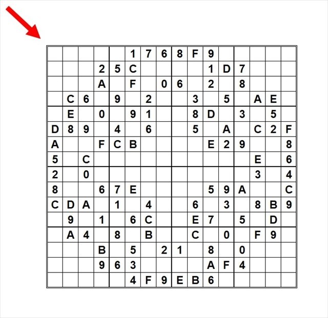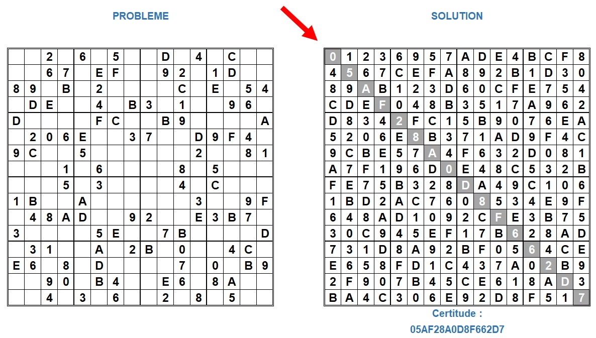 A chaque étape, compléter l'Hexadoku à l'aide des caractères 0, 1, 2, 3, 4, 5 6, 7, 8, 9, A, B, C, D, E et F de façon que chaque ligne, chaque colonne et chaque région de 4x4 cases comportent ces 16 caractères. Une fois la grille complétée, transcrivez la chaîne de caractères contenus dans la diagonale dans Certitude (voir exemple). Toutes les grilles proposées se remplissent facilement en utilisant les méthodes inclusive et exclusive. Pour les fans de la programmation, l'ordinateur vous donnera chaque solution en moins d'une seconde une fois le programme au point!