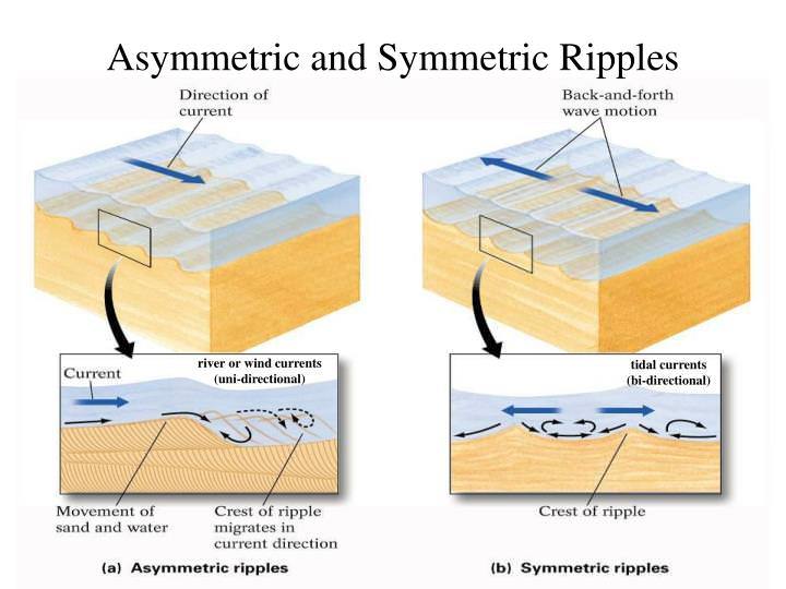 There are two different types of ripple marks, symmetrical and asymmetrical. Symmetrical ripple marks are created by two way currents (wave hits the beach, then retreats). As a result, the crest is pointed and the trough is rounded. The crest refers to the top of the ripple mark while the trough is the bottom (the low point between two crests). What this means is that the ripple mark won't be inclined toward a certain direction. In contrast, asymmetrical ripple marks are created by one way currents. The crests will still be pointed and troughs rounded, but they will be inclined more strongly in direction of the current.