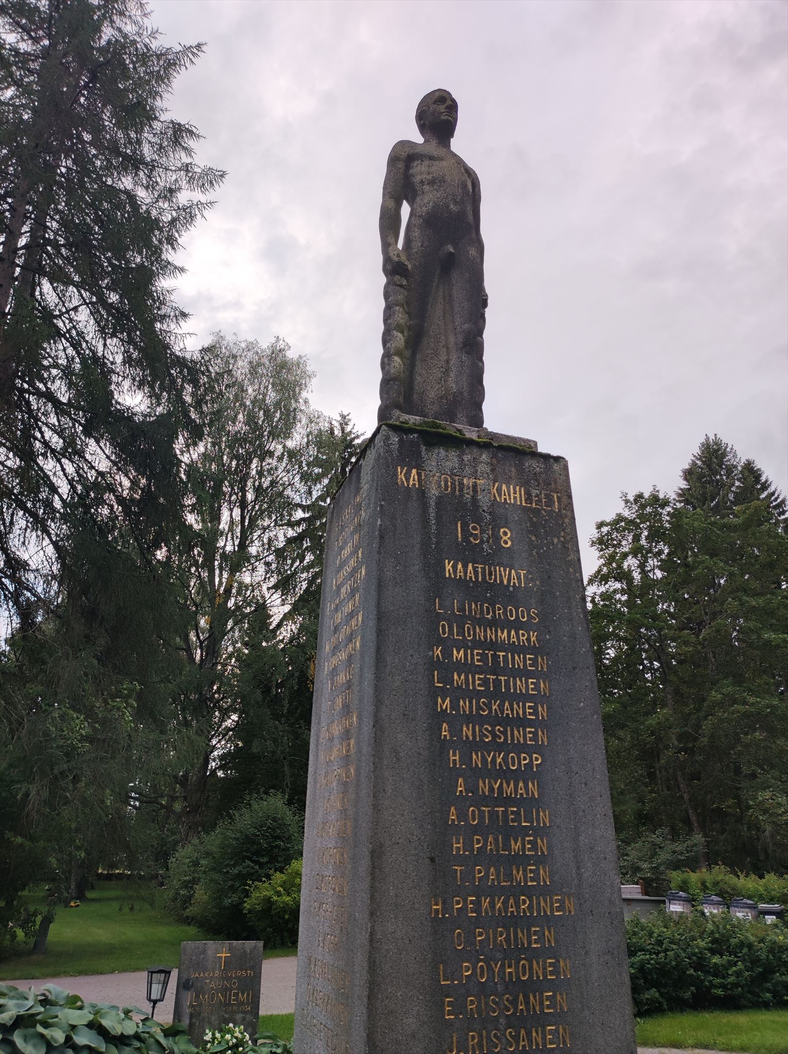 Aloituskoordinaateissa on Katkotut kahleet-muistomerkki. Katso kuvan mukaisesta suunnasta muistomerkkiä ja näät nimiä. Alimman nimen toinen kirjain on A.