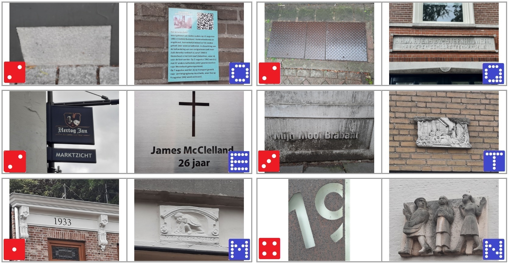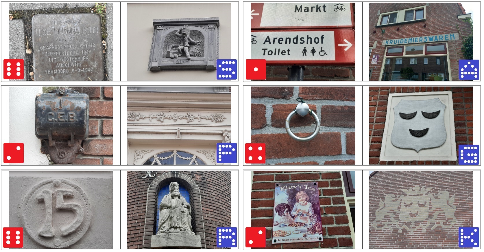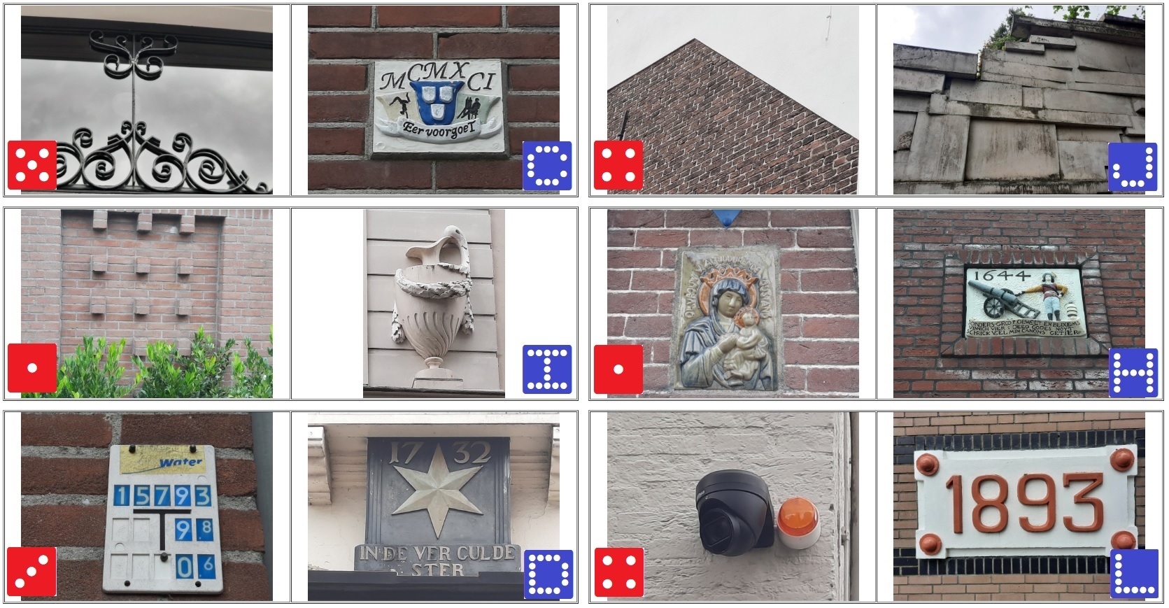 De rechter helft van het kaartje toont je de gevel(steen) met hierbij de letter, de corresponderende getalwaarde vind je op de linker helft van een andere dominosteen. Op deze linker helft zie je een foto van een detail in de buurt van het object met de letteraanduiding. Soms zal je goed om je heen moeten kijken, want de foto met de getalwaarde kan best achter je liggen, of om een hoekje, maar wel altijd binnen 10 meter van de letter.