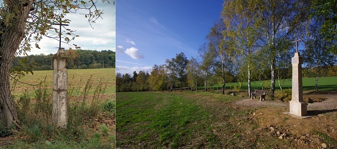 Křížek na starém (vlevo - hlavati.cz) a novém umístění