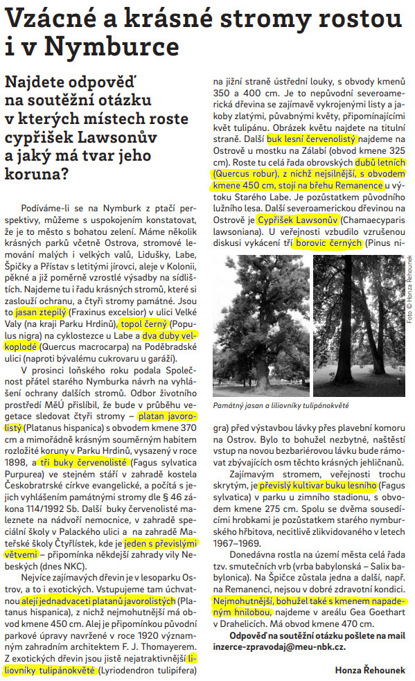 Druhá: … o rok a fous později jsem měl tu čest odlovit Polmařin vynikající letterbox GC9D3G1 Arboretum sídliště. Tahle prácička mě naprosto uchvátila a já si po odlovu v putyce vzpomněl na výstřižek, který stále trůní na mé lednici přidělán neodymovým magnetem. Řekl jsem si, že trochu rozšířím perimetr a protáhnu Vás rovnou po celém štatlu. Nymburk je prostě nádherný v tisících ohledech, a zajímavé a vzácné stromy prostě nemohou být výjimkou!