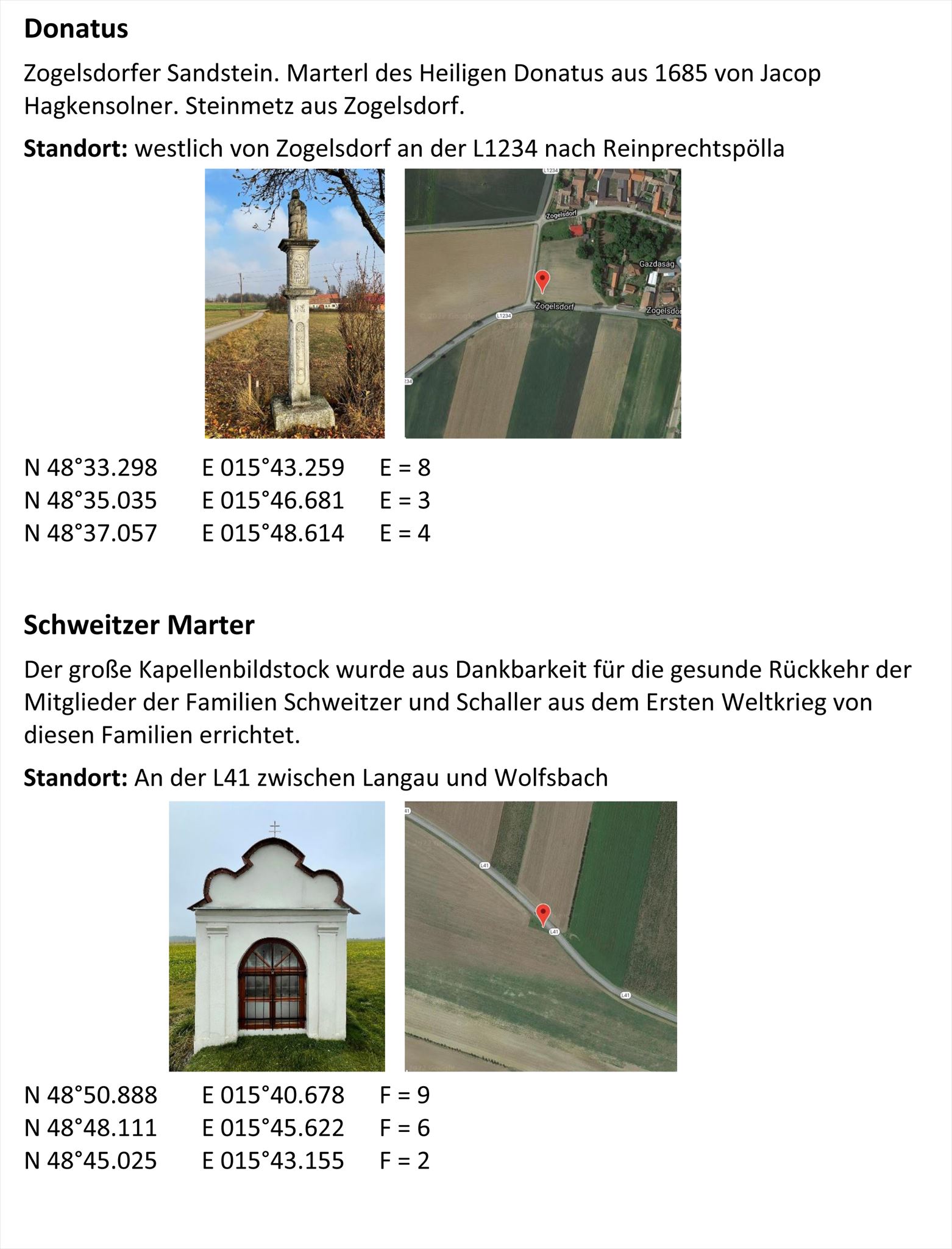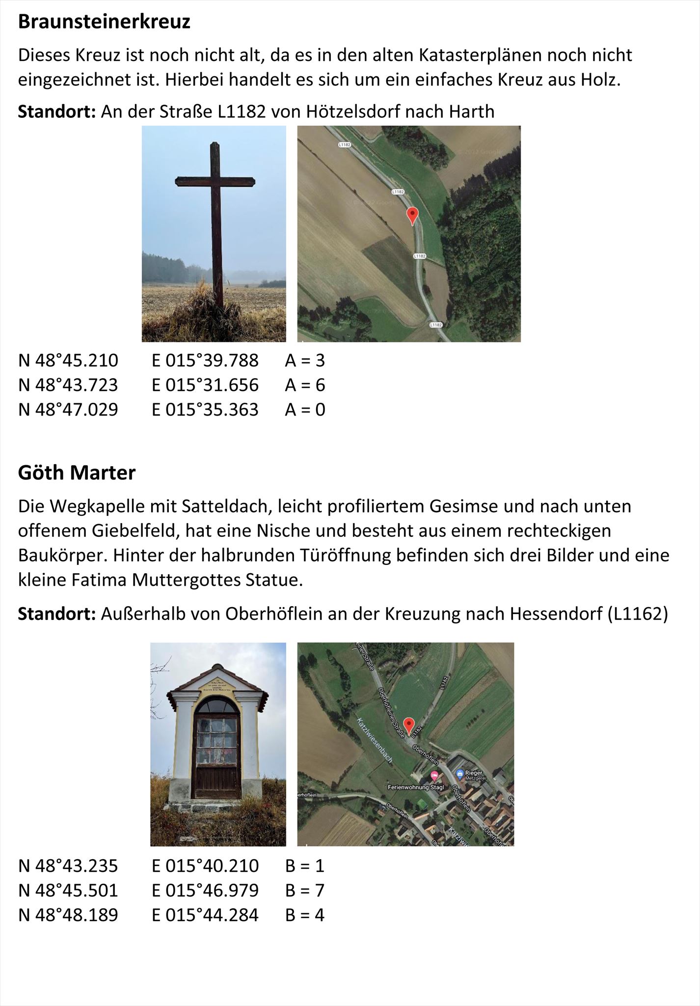 Finde den richtigen Standort der unten angeführten Kleindenkmäler und du hast die passenden Variablen.