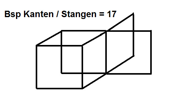 In der Bildmitte fällt ein interessantes Klettergerüst-ähnliches Objekt auf. Eine Kante ist dabei die Stange zwischen zwei anderen Stangen. Wie viele Kanten/Stangen hat dieses insgesamt (Innen und Aussen)? Anzahl Kanten = N