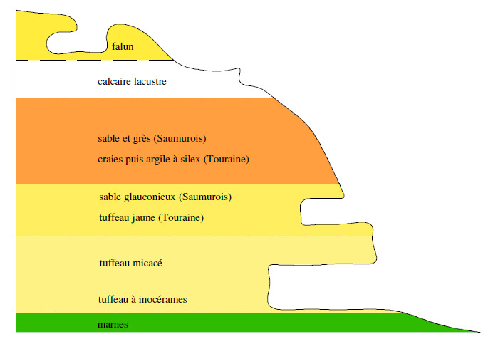 Voici cent millions d’années, au milieu de la période Crétacé, l’érosion du Massif Armoricain et du Massif Central amène dans un vaste delta couvrant la région des graviers, sables et argiles au sein d’une mangrove et autres végétations tropicales. Progressivement, la mer monte ; au Turonien, au fond d’une mer chaude, peu profonde, se dépose une boue calcaire composée d’argile, de sable et surtout des restes d’organismes marins. Au fil du temps et sous l’effet du chargement des terrains, cette boue va se compacter pour former au final le tuffeau, une roche tendre, poreuse, légère, emblématique du Val de Loire, facile à creuser et à l’origine des carrières, caves et habitats troglodytiques. Un centimètre de cette roche correspond à 300 années de dépôts ; ce qui, sur l’ensemble de l’étage turonien (94 à 90 millions d’années) abouti à une épaisseur d’environ 100 mètres. Le tuffeau n’est toutefois pas une roche homogène ; sa composition change avec le temps avec les variations du climat, et géographiquement avec, au Turonien supérieur, des sables glauconieux en Saumurois et de tuffeau « jaune » compact en Touraine.