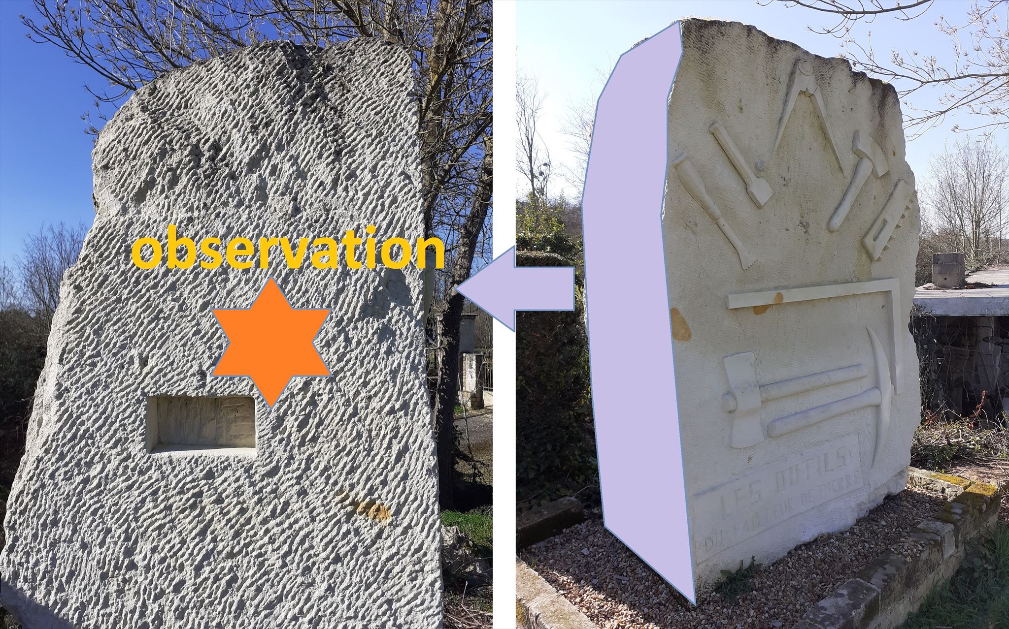 Zone d'observation - Placez-vous face à la "stèle" de la photo, et appuyez vous sur la leçon de géologie pour répondre aux questions suivantes