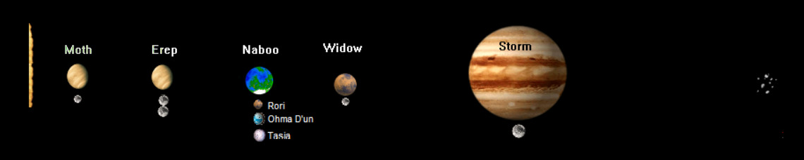Naboo er den 3. planet i stjernesystemet af samme navn og stjernesystemet kredser om stjernen Naboo. Naboos stjernesystem består af 5 planeter: Moth, Erep, Naboo, Widow og Storm.