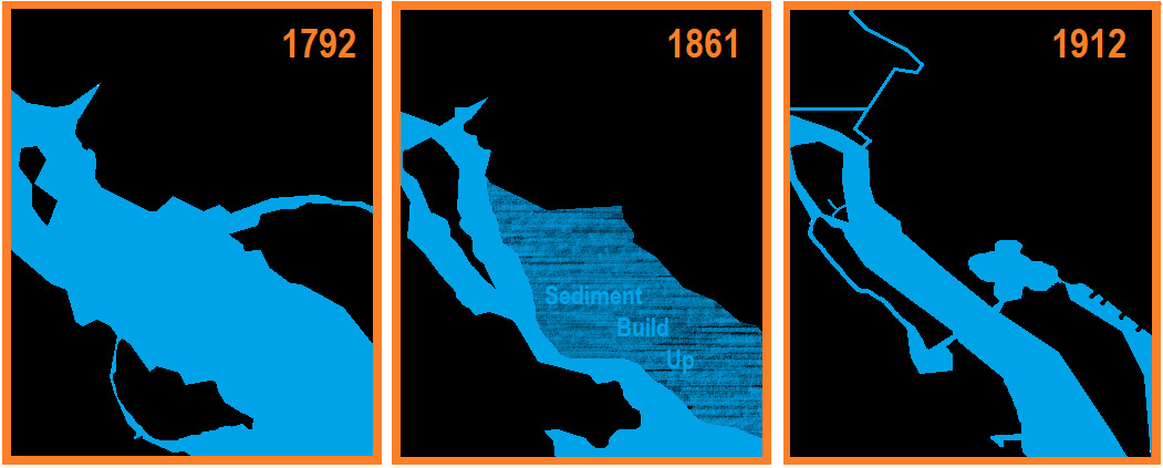 In the image above you can see that the Potomac was wide and clear in 1792. As people moved into the area the landscape changed. Many years of land clearing for agriculture, construction, and mining caused erosion to speed up. Withouth the vegitation, fine-grained soils easily washed into the river during storms and slowly built up along the shores of DC. The result was an increased amount of silt and clay in the water bodies that drain the area and allow boats to freely travel up and down the river. By 1861 this sedimentation built up along the western shore of DC in what was called the Potomac Flats.